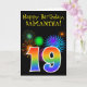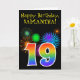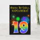 La face avant de cette carte d'anniversaire amusante et vibrante présente un motif coloré inspiré de feux d'artifice, ainsi que le nombre "19" avec un dégradé multicolore semblable à un arc-en-ciel, sur un fond noir. La face avant comporte également un message de vœux d'anniversaire, y compris un nom de destinataire personnalisable. L'intérieur comporte un message d'anniversaire personnalisé, ou pourrait éventuellement être laissé en blanc si un message doit être écrit à la main à la place. Une carte d'anniversaire personnalisée comme celle-ci pourrait être un moyen amusant d'envoyer un message pour célébrer le dix-neuvième anniversaire de quelqu'un.