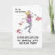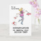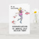 Une carte de félicitations pour une petite amie, avec une fille dansant vers sa voiture, les clés de voiture à la main et déchiquetées les plaques de L dispersées derrière elle : d'une aquarelle de Judy Adamson.
