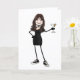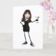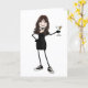 Une fille dessinée mignonne avec de longs cheveux noirs, portant une robe de cocktail noire et des baskets, tenant un martini sur fond blanc.