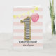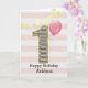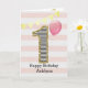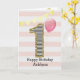 Une carte de 1er anniversaire pour fille rose et or que vous pouvez personnaliser avec son nom. Le devant de cette carte tendance de 1er anniversaire pour elle présente le chiffre un dans une rayure noire et blanche avec un contour de paillettes et un ballon rose prêt à s'envoler. Veuillez noter que les paillettes sont un effet de design et qu'il n'y aura pas de vraies paillettes sur cette carte d'anniversaire. Le fond est un blanc et rose doux avec une bannière dorée claire en haut. Le message à l'intérieur peut être facilement personnalisé si vous le souhaitez. Un joli souvenir de carte de 1er anniversaire pour elle.