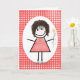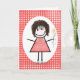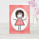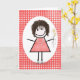 Fille de dessin animé bâton mignonne avec des cheveux crépus, des baskets, une robe à carreaux, un collier de perles et un bouquet de marguerites sur fond à carreaux rouge et blanc.