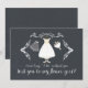 Carte contemporaine "Veux-tu être ma fille d'honneur" représentant une robe de mariée, une voilette, des fleurs et des chaussures avec une jolie police manuscrite sur un fond moderne de tableau noir craie.