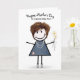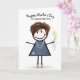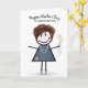 Jolie fille en forme de bâton avec des cheveux, robe bleue en jean, collier de perles, baskets, et tenant un bouquet de marguerites sur fond blanc pour la fête des mères de la belle-mère.