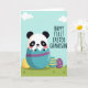 Designed with a sweet spring scene, this card features a round-faced baby animal with black patches around its eyes and ears, peeking out of a large eggshell as if just arriving for a first celebration 🐰. The little creature’s soft pink cheeks and gentle, forward-leaning pose give it an affectionate, almost cuddly look. The oversized shell is teal with a wide purple band, sitting low in a grassy foreground that feels fresh and welcoming. Around it, smaller decorated eggs in sunny yellow, striped teal, and spotted purple rest in the grass like they were placed there for a shared family moment 🌷. A light blue sky stretches behind everything, dotted with puffy white clouds that keep the scene calm and bright. On the right side, the text reads “HAPPY FIRST EASTER GRANDSON” in uppercase letters, set in a dark tone that stands out clearly against the pale sky. The words are stacked in a neat column so the message balances the character on the left. In the background, the clouds are rounded and lightly shaded against the soft blue sky.