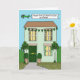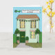 A simple illustration of a green house, decorated with shamrock shaped balloons and bunting. here is a plane flying over the house which has a banner behind it. The banner says 'Happy first S. Patrick's Day as a Family'.