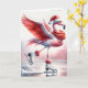 Un flamant vêtu d'un chapeau de Père Noël et d'une écharpe aux ailes étirées patinent gracieusement sur une surface glacée. Tout le texte peut être modifié.