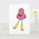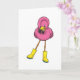 Carte Flamant rose sous la pluie avec des bottes en caou
