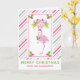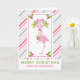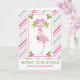 Une carte de vœux de Noël tropicale fantaisiste - style carte pliée. Un fond rayé de cannes à sucre rose et vert. Superposé par-dessus se trouve un flamant rose élégant avec une patte levée. Portant un chapeau de Père Noël rose et du houx saisonnier. Du houx avec des baies décore également les coins. Un bouquet floral au-dessus de sa tête avec des cannes à sucre croisées.