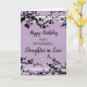 Carte d'anniversaire pour fille en droit avec de jolies fleurs de cerisiers violets et noirs et des vers réfléchis.