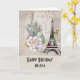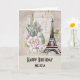 Une carte de voeux Happy Birthday personnalisée avec un joli collage de fleurs peintes et des postmarks vintages avec une illustration noire de la tour eiffel. Le design chic et chic. Texte personnalisé sur le devant écrit au-dessus d'une image de burlap. Message personnalisé à l'intérieur de la carte.