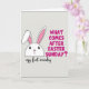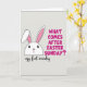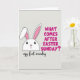 This greeting card features a simple cartoon rabbit peeking up from the lower left, with a white face, large dark eyes, and a small pink nose that gives it a sweet, friendly look 🐰. One ear stands straight with a pink inner section while the other droops to the side, adding a gentle, teasing charm as if it’s leaning in to share a joke with someone close. On the right side, a big question appears in all-capital bubblegum-pink letters near the upper area, grabbing attention like a cheerful call-out. Beneath that, closer to the rabbit’s eye line, the answer is written in flowing black cursive lettering that feels like a soft note passed between friends. The contrast between the rounded pink capitals and the smooth black cursive creates a flirty back-and-forth, like two voices trading lines. Everything sits on a light gray background with a faint texture, keeping the focus on the rabbit and the text 🌷. The pink headline sits to the right of the rabbit’s ears, and the black cursive line runs below it, with the rabbit’s face angled toward the words.