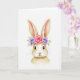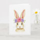 This card features a soft watercolor portrait of a long-eared bunny 🐰 centered on a bright white background, showing its head and upper chest in gentle cream and warm brown washes. The fur is painted with light gradients and feathery strokes that make it look touchably soft, while the dark, glossy eyes and tiny lashes give the bunny a tender, affectionate gaze, like it’s quietly leaning in. A small pink nose sits above fine curved whiskers, adding to the sweet, friendly expression. Resting on its head is a floral crown with a large pink rose in the middle, two lavender-purple blossoms to either side, and airy green leaves tucked between them 🌷. The overall scene feels like early spring, with translucent layers and thin lines that keep the details delicate rather than heavy. There is no text on the front, leaving the white space open and uncluttered around the bunny’s face. The crown’s pink rose shows layered petals with pale highlights, and the lavender flowers have soft violet centers fading into lighter edges.