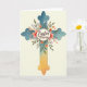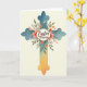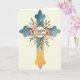 Designed with a creamy off-white background, the front centers on an ornate cross with rounded, clover-like tips that feels calm and timeless. A soft, watercolor-style gradient runs from deep teal at the top down into golden ochre near the base, like daylight warming the page. Where the arms meet, a bouquet blooms outward in coral-peach, tangerine, and light lavender, with fresh green leaves curling around the edges 🌷. The flowers lean into the center as if in a gentle embrace, giving the arrangement a close, affectionate feel. Tucked inside the floral cluster is an irregular oval plaque with a thin border, holding a short seasonal greeting. The text sits centered within the plaque in a dark gray, flowing handwritten style that stands out without looking harsh 🐇. Soft, misty paint edges and subtle shading surround the cross and petals, with a few leaves overlapping the plaque’s border for depth.