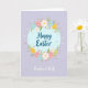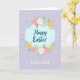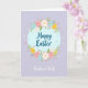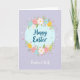 Designed with a soft lavender background, this digital illustration centers on a light blue circular medallion that feels like a springtime spotlight. Across the middle of the circle, the words “Happy Easter” appear in flowing lettering in a darker blue, standing out clearly against the pale center. A floral wreath wraps around the medallion, mixing white flowers with yellow centers, small sky-blue petals, and textured pink blooms tucked among layered green leaves and tiny berry-like dots 🌷. Two decorated egg shapes sit within the wreath—one sunny yellow with fine stripe details and one fresh green with matching lines—adding a gentle seasonal accent. Around the main design, small red and white hearts drift like quiet signals of affection, suggesting a close bond between family members. Scattered sparkles and tiny dots float outward to keep the scene light, with a sweet, friendly tone 🐰. Near the bottom, “Nephew & Wife” is placed in similar flowing lettering, with small hearts and speckled accents nearby in soft red, white, and pale tones.