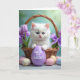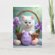 On the front of the card a fluffy snow-white kitten with bright blue eyes sits snugly in a rustic woven basket, gazing forward with a gentle, affectionate look that feels like a quiet hello between close friends. Its small paws rest on a smooth lavender egg centered in the basket, and the egg carries a short “first” milestone message in neat lettering. Around the kitten, purple tulips and soft bows tuck into the weave, adding springtime color and a tender, romantic touch like a bouquet placed just for someone special 🌷. The lighting is soft and diffused, giving the fur a glowing edge and keeping the scene calm and cozy. Behind the basket, the background fades into a blurred wash of teal and fresh greens, suggesting an outdoor garden without showing any sharp details. In the lower area, several pastel eggs are scattered across the foreground, some decorated with tiny star shapes and others marked with fine crack-like patterns that look carefully drawn. The greeting text sits above the main image in a light purple tone, while the “first” message appears on the lavender egg near the center 🐰.