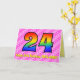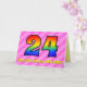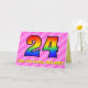 Cette carte de vœux d'anniversaire 24 ans amusante et festive présente un recto avec un grand chiffre "24" ayant un motif dégradé inspiré du spectre coloré de l'arc-en-ciel, sur un fond à rayures de cœurs rose clair et rose foncé. Le recto comporte également le message "Joyeux 24e anniversaire" et un nom de destinataire personnalisé. L'intérieur comporte un message de vœux d'anniversaire personnalisé, ou pourrait éventuellement être effacé et laissé vierge si un message doit être écrit à la main à la place. Une carte d'anniversaire personnalisée comme celle-ci pourrait être un moyen amusant et heureux d'envoyer des vœux d'anniversaire à quelqu'un qui célèbre son vingt-quatrième anniversaire.