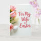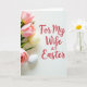 This design shows a calm, light background where a vertical spray of blossoms drifts down the left side like a gentle border. Near the top left, two pink tulips open toward each other, their petals angled as if sharing a quiet, affectionate glance 🌷. Just beneath them sits a cream-colored tulip with smooth petals, adding a soft contrast to the pink tones. Lower on the left, a layered pink rose nestles close to a small white oval with light speckles, giving a subtle seasonal touch 🐇. The lighting looks diffused and airy, making the flowers appear fresh and softly shaded rather than sharp. On the right half, the message “For My Wife AT Easter” is placed prominently in a deep crimson, flowing lettering, with “For My Wife” larger above and “AT Easter” set below. The crimson text stands out against the pale background while the blossoms and speckled oval remain clustered along the left edge.
