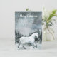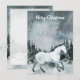 Une carte de vœux personnalisable, carte de Noël Joyeux Noël avec un cheval blanc peint à l'aquarelle sur fond de forêt de plaine boisée en hiver au crépuscule. Le dos de la carte comporte un fond opaque pour écrire un mot.