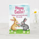This design shows two upright long-eared animals facing each other in the lower middle of the scene, their gentle expressions and slightly tilted heads suggesting close friendship 🐰. Behind them, a soft wash of blue-green sky fades into a light blush near the horizon, giving the setting a calm spring morning feel. The left figure is a warm tawny color with rosy cheeks, holding out a patterned oval token toward the right figure in a tender, offering gesture. The right figure is a quiet grey with a small fluffy white tail, looking back with an attentive, trusting gaze. Across the upper sky, a seasonal greeting appears in fuchsia hand-lettered text, spaced widely so it floats above the pair without crowding them. A smaller line of text sits below in a darker, muted tone, centered near the lower area to read as a gentle follow-up message. Along the bottom edge, bright green grass is dotted with small white-petaled flowers 🌷. The oval token between them has candy-like stripes in electric blue, sunny yellow, and vivid pink.