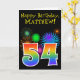 L'avant de cette carte de voeux d'anniversaire amusante et vibrante présente un motif coloré inspiré par des feux d'artifice festifs, ainsi que le numéro "54" avec un arc-en-ciel multicolore comme un motif dégradé, sur un arrière - plan de couleur noire. L'avant comporte également un message d'anniversaire, y compris un nom de destinataire personnalisable. L'intérieur comporte un message de voeux d'anniversaire personnalisé, ou peut-être pourrait-il être effacé et laissé vide si un message doit être écrit à la main à la place. Une carte d’anniversaire personnalisable comme celle-ci pourrait être une façon amusante de reconnaître le cinquante-quatrième anniversaire de quelqu’un. [~Z0000330]