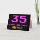 The front of this fun, geeky, and nerdy birthday greeting card design features a large pink number "35", along with the message "HAPPY BIRTHDAY," in pink, and a bold yellow editable recipient name. The text has a look inspired by that of classic 8 bit style video game and top graphics from the 1970s and 1980s, and the background is colored black. The inside has a personalized birthday greeting message, or could perhaps be cleared and left blank if a message is to be written by hand instead. A silly customizable birthday card like this might be a fun way to send a message celebrating somebody’s thirty fifth birthday. [~Z0000478]