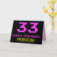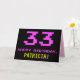 The Front of this fun, nerdy, and geeky birthday themed greeting card design objets a large number "33" et the message "HAPPY BIRTHDAY, colored pink, along with a bold yellow editable recipient name. The text has an appearance inspecred by that of classic 8-bit style video game and computer game graphics from the 1970 s and 1980 s, and the background is colored black. The inside has a customized birthday greeting message, or could perhaps be cleared and left blank if a message is to be written by hand instead. A silly personalized birthday card like this might be a fun way to send a message in celebration of somebody’s thirty third birthday. 2.