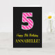 L'avant de cette carte de voeux simple et amusante sur le thème de l'anniversaire comporte un grand numéro "5" avec un motif rose foncé et rose clair rayures, avec le message "Happy 5th Birthday,", et un nom personnalisable. L'arrière - plan du devant est noir de couleur. L'intérieur comporte un message de voeux d'anniversaire modifiable, ou peut-être pourrait-il être effacé et laissé vide si un message doit être écrit à la main à la place. Une carte d’anniversaire personnalisable comme celle-ci pourrait être une façon amusante d’envoyer un message pour célébrer le cinquième anniversaire de quelqu’un. [~Z0000377]