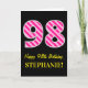 Le devant de cette carte de voeux simple et amusante à thème d'anniversaire comprend un grand numéro "98" avec un motif rose foncé et rose clair rayures, avec le message "Happy 98th Birthday," et un nom modifiable. L'arrière - plan du devant est noir de couleur. L'intérieur comporte un message d'anniversaire personnalisé, ou pourrait être effacé et laissé vide si un message doit être écrit à la main à la place. Une carte d'anniversaire personnalisable comme celle-ci pourrait être une façon amusante d'envoyer des voeux d'anniversaire à quelqu'un qui célèbre son quatre-vingt-dix-huitième anniversaire. [~Z0000377]
