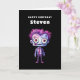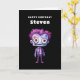 Carte d'anniversaire avec une jolie illustration. Monstre Frankenstein aux cheveux roses et violets et costume et cravate en dapper.