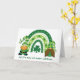 Deux petits gnomes rigolos se tiennent à chaque extrémité d'un arc-en-ciel irlandais décoré et vert sur le devant de cette carte de voeux de St Patrick's Day. Un grand shamrock vert se trouve au fond de l'arc-en-ciel, et chacun des gnomes porte des casquettes shamrock décorés. Le texte en bas dit "A la fin de chaque arc-en-ciel..." La pensée se termine à l'intérieur, avec le texte qui dit "...est un gnome qui prétend être un leprechaun". N'oubliez pas de sourire cette saison avec la tendance folie du gnome ! Tout le texte, à l'avant et à l'intérieur, peut être customisé à tout ce que vous voulez.