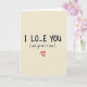 This Valentine’s Day card shares a sweet message with a clever twist. Centered on a soft beige background, the bold black text reads “I LO_E YOU,” instantly catching the eye. Just below, a smaller handwritten-style line adds humor with the words “(You’ll get the ‘v’ later),” turning the message into a lighthearted inside joke. A bright red heart sits beneath the text, drawn with gentle imperfections that give it a warm, heartfelt feel. The cream-toned background allows the lettering and heart to stand out beautifully. This card feels personal, affectionate, and fun, making it a lovely way to share love and anticipation with someone special on Valentine’s Day