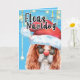 Un dessin au crayon de couleur drôle et mignon réaliste du visage d'un chien espagnol du roi Charles Cavalier portant un chapeau de Père Noël rouge bordé d'une fausse fourrure blanche portant des abat-jour matés de fil et un nez de renne rouge. Il est enchevêtré dans les lumières des arbres de Noël et est encadré par de longues lumières verticales à cordes et un arrière - plan bleu ciel. La couverture extérieure dit "fleas navidog" et l'intérieur "happy howlidays". Idéal pour les souhaits de fin d'année d'affaires aux clients ou comme une adorable carte de vacances à des amis et à la famille.