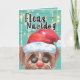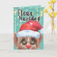 Une illustration amusante et mignonne d'aquarelle d'un chien Multipoo portant un chapeau de Père Noël rouge bordé de fausse fourrure blanche portant des abat-jour moulés et un nez de renne rouge. Il est enchevêtré dans les lumières des arbres de Noël et est encadré par de longues lumières verticales à cordes et un arrière - plan bleu turquoise. Idéal pour les souhaits de fin d'année d'affaires aux clients ou comme une adorable carte de vacances à des amis et à la famille.