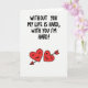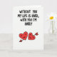 This bold card delivers a humorous and affectionate message with confidence. The phrase “WITHOUT YOU MY LIFE IS HARD, WITH YOU I’M HARD!” is printed in thick black lettering across a bright white background, making the words impossible to miss. Beneath the message sit two smiling red hearts that soften the statement with charm and warmth. One heart is pierced with a small golden arrow, adding a classic romantic detail. The strong contrast of black text, red hearts, and white space keeps the focus on the message while letting the design breathe. This card blends cheeky humor with genuine affection, making it a memorable and lighthearted choice for Valentine’s Day ❤️