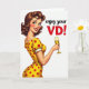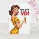 This Valentine's Day card shows a retro-style woman smiling right at you with a confident, friendly look. She has brown curled hair, bright blue eyes, rosy cheeks, and red lipstick, and her expression feels flirty but warm. She’s wearing a fitted yellow dress covered in red polka dots, which stands out strongly against the plain white background. In one hand, she holds a slim champagne flute filled with a golden drink, hinting at a little celebration. To the right of her, the text says “enjoy your” in black script, followed by “VD!” in red block capital letters. The mix of sweet and cheeky wording gives the card a funny, grown-up twist while still feeling romantic. It’s a simple, eye-catching design that works for a partner or a close friend, with a little extra sparkle ❤️💌🍫.