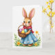 This card shows a light brown, upright bunny-like character with long, expressive ears and a wide open smile that feels like it’s meant for someone special 🐰. It wears a sky-blue dress with small white flower details, plus a deep red scarf wrapped neatly at the neck, giving the pose a cozy, caring look. The character holds a woven basket close to its body, as if offering it with friendly affection. Inside the basket sit four smooth eggs in soft pastel purple, pink, yellow, and pale blue, each catching a gentle highlight. The background stays bright white, keeping all attention on the character and its tender, inviting stance. A short greeting appears near the top in a soft, medium-weight style, set in a light spring color that stands out without being harsh. Near the bottom edges, a few green leaves and small yellow blossoms rise into view like early spring 🌷. Fine whiskers, rosy cheeks, and crisp outlines finish the scene, with the flowers clustered low and slightly to the sides.