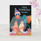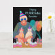 Joyeux anniversaire, carte de vœux en papier présentant une illustration colorée de fête d'anniversaire de chat avec une dame âgée et deux chats en mode fête. Les chats portent des chapeaux de fête ainsi que la dame qui porte également des lunettes de soleil bleu foncé. Une rangée de cupcakes avec des bougies d'anniversaire est sur la table. Des ballons et un cadeau font également partie du design. Art, image et vers copyright © Shoaff Ballanger Studios, 2023.