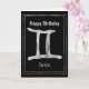 Envoyez une carte de voeux Happy Birthday personnalisée à votre Gemini préféré avec ce Gemini en argent martelé stylisé Gemini l'astrologie Twins signe en étoile zodiac dans un cadre en argent double ligne sur un arrière - plan noir. Le texte du Joyeux Anniversaire et du Zodiaque sur le devant de la carte peut être personnalisé si vous avez un autre message d'accueil en tête. À l'intérieur de la carte, vous pouvez ajouter le nom de la fille ou du garçon d'anniversaire au-dessus du texte qui dit : Vous allez avoir un anniversaire formidable, il est écrit dans les étoiles. Une carte personnalisée amusante pour quelqu'un né sous le signe étoilé de Gemini.