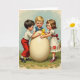This design shows three young children gathered closely around an enormous pale ivory egg that fills most of the scene, its smooth surface catching a soft glow. Two boys and a girl circle it with careful hands, and their leaning shoulders and shy smiles suggest a shared secret between close friends. On the left, a boy in a white shirt and red trousers watches the egg with focused curiosity, his dark shoes set neatly in the grass. In the middle, a blond boy wearing a sailor-style collar looks on with a gentle, affectionate gaze, as if waiting for the others to react first. On the right, a girl in a white dress with red floral stitching and a deep red sash holds a small yellow toy duck 🐰 and reaches it toward the egg like a friendly introduction. Above the illustration, a short Easter greeting appears in small red lettering, centered near the top, while the rest of the space stays open and airy. The background shows a pale blue sky with light clouds over green grass sprinkled with tiny golden bits, with a white ribbon in the girl’s hair and a few small 🌷 details near the lower edge.
