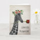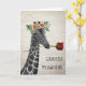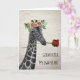 Une carte de Saint-Valentin avec une image en noir et blanc d'un girafe avec une couronne de fleurs tenant une rose rouge dans sa bouche sur un fond de briques blanches. Le texte dit : "Girafeter mon propre cœur".