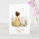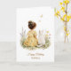 A gentle illustration of a young girl in a yellow floral dress sitting beside a white cat, both viewed from behind. Surrounded by soft wildflowers and delicate butterflies, the composition is set against a clean background, creating a calm and dreamy atmosphere that highlights companionship and quiet moments in nature.