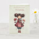 Birthday card with a cute retro image featuring a whimsical girl with rosy cheeks and flowers in her hair. Carrying a green frog doll.