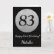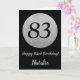 Happy 83rd Birthday Black and Silver Glitter Card with personalized name. For further customization, please click the "Customize it" button and use our design tool to modify this template.
