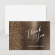 This elegant modern flat wedding thank you card features a faux glitter border on a bronze faux brushed metal background. The text is in modern handwriting script and sans serif font, with spaces for guests' names and responses. The reverse side is left blank for you to add a personal message.