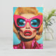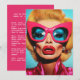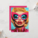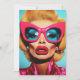 Un portrait surprenant et de haute couture d'une diva glamour avec des cheveux blonds volumineux, des lunettes de soleil roses et chaudes, des lèvres rouges audacieuses et un pré bleu électrique. Le look est féroce, rétro, et sans s'excuser fabuleux — un rêve pop-art aux couleurs vives.