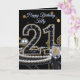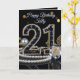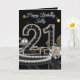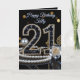 Celebrate a milestone 21st birthday in ultra-chic style with this personalized, luxurious greeting card. The design features the large "21" number prominently displayed, richly embellished with shimmering black faceted gems and surrounded by white brilliant diamond accents set against a bold black background. This elegant black and gold theme instantly communicates glamour and high-end sophistication, perfect for anyone turning 21.