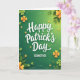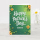 This greeting card features “Happy Patrick’s Day” centered near the top in white lettering with a thin emerald outline, with “GODMOTHER” placed directly below in neat, uppercase white text. Behind the words, a green gradient glows from bright lime in the middle to deeper moss tones around the edges, like a soft spotlight on the message. Shamrocks and four-leaf clovers scatter across the scene, curving inward to frame the text and guide your eye. Some clovers are classic green, while others shift to golden-orange and sunny yellow, adding a warm contrast that feels like a friendly wink between loved ones 💚. The clovers have a slight layered look, giving them gentle depth against the smooth background. Fine line accents and small foliage shapes peek out from the darker edges, adding texture without crowding the center. A cluster of orange-yellow clovers sits off to one side, glowing against the deep green border with a small ☘️ nearby.