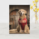 Un récupérateur d'or portant une chemise rouge avec le mot "RETRAITÉ" se trouve devant une cabane en bois rustique et un tonneau. Le texte peut être modifié.