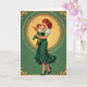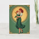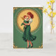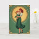 On the front of the card the artwork centers on a gentle woman in an emerald gown holding a small child close, their faces tilted toward each other in a quiet, affectionate gaze 💚. Her long auburn hair falls in soft waves, and the dress shows white puffed sleeves with flowing folds that echo the curve of her arms. The baby has golden-red curls and tiny gold wings, tucked against her shoulder as if settling into a familiar embrace. Behind them, a glowing yellow-gold background creates a soft halo effect, giving their skin and hair a warm shine. A detailed circular gold wreath surrounds the pair, drawing your eye inward like a framed portrait. Outside the circle, a deep green field fills the card, with gold corner flourishes, and small St. Patrick’s Day text in gold placed neatly along the lower edge with a subtle ☘️ nearby. The border stays rich emerald with ornate gold accents at each corner and a luminous gold ring enclosing the figures.