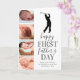 Carte de la fête des pères pour nouveau papa adorable avec un fond blanc simpliste qui peut être changé en n'importe quelle couleur, un collage de 4 photos de votre bébé, une silhouette de golfeur, la phrase "bonne première fête des pères", et une légende papa qui est facilement personnalisable.